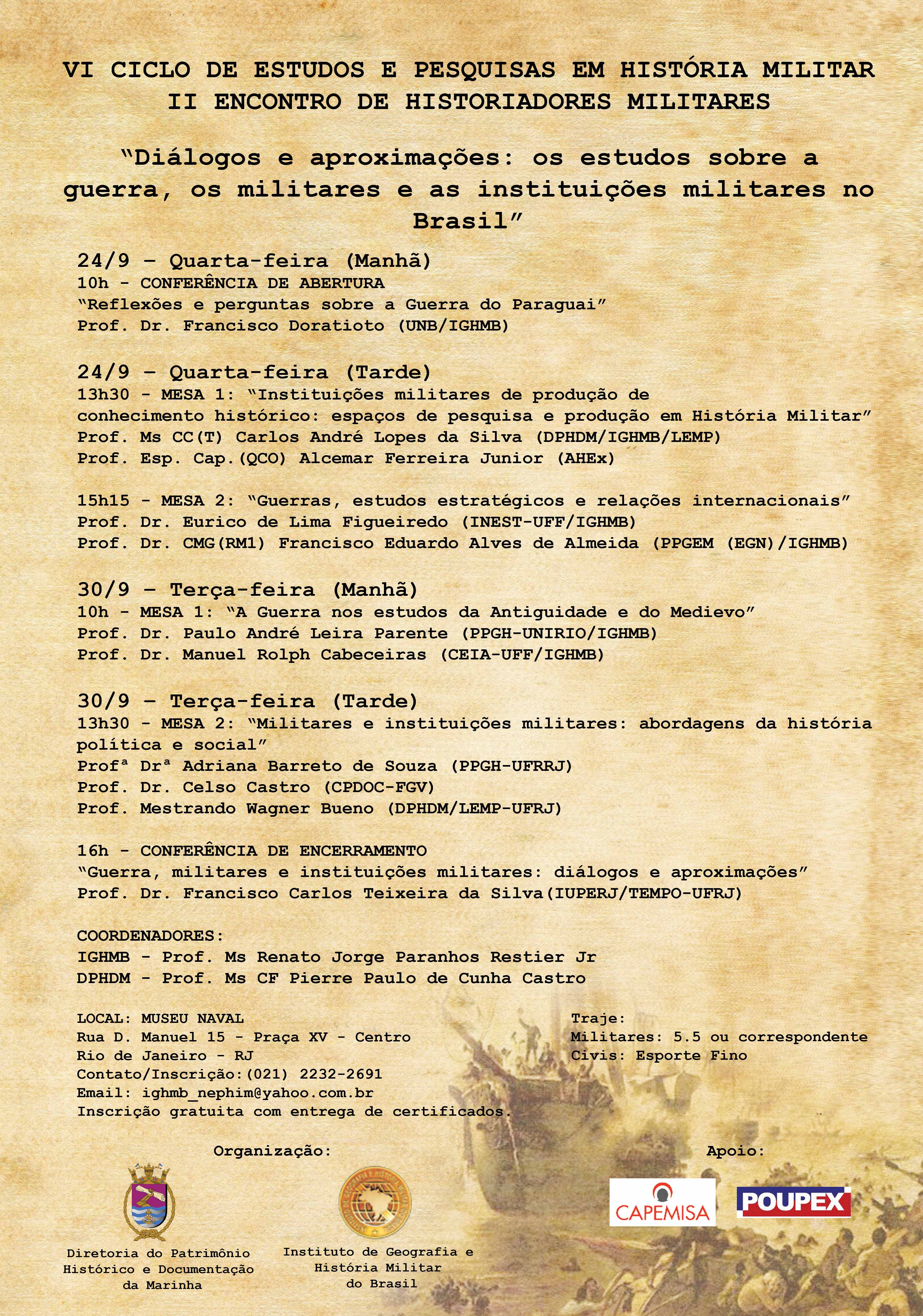Coordenado pelos professores Renato Paranhos Restier, do Instituto de Geografia e História Militar do Brasil (IGHMB), e Pierre Paulo de Cunha Castro, capitão-de-fragata da Diretoria do Patrimônio Histórico e Documentação da Marinha, (DPHDM), os eventos abordarão temas como a Guerra do Paraguai; Guerras, Estudos Estratégicos e Relações Internacionais; e a Guerra nos Estudos da Antiguidade e do Medievo.