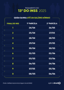 Este será o sexto ano seguido em que os segurados do INSS receberão o décimo terceiro antes das datas tradicionais, em agosto e em dezembro. Em 2020 e 2021, o pagamento ocorreu mais cedo por causa da pandemia de covid-19. Em 2022 e 2023, as parcelas foram pagas em maio e junho. No ano passado, o pagamento ocorreu em abril e maio, como neste ano.