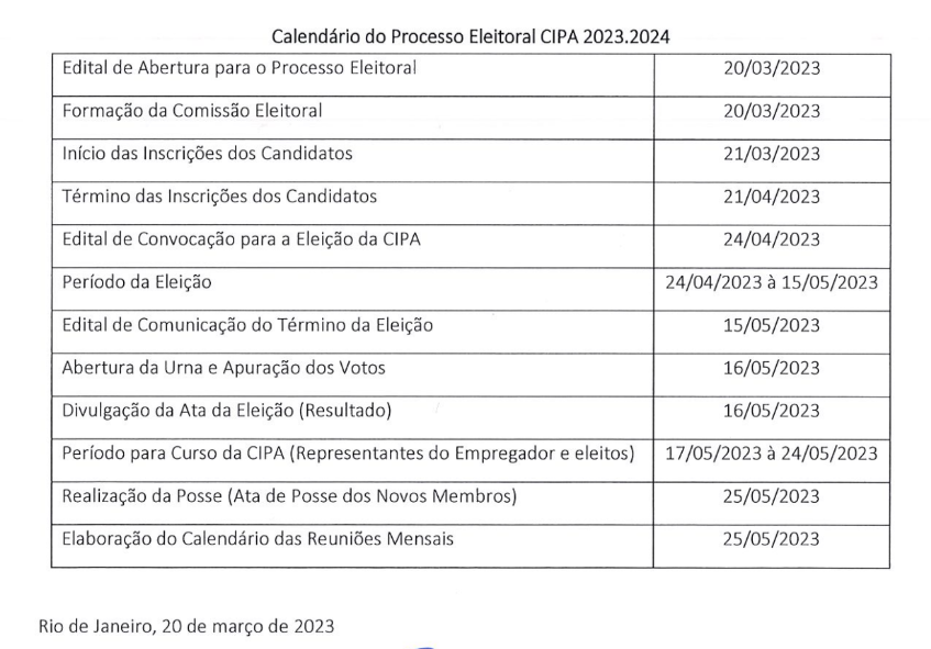 O Processo Eleitoral da CIPA 2023/2024 seguirá o calendário abaixo, e será comunicado por email cada etapa com as suas respectivas instruções de participação.